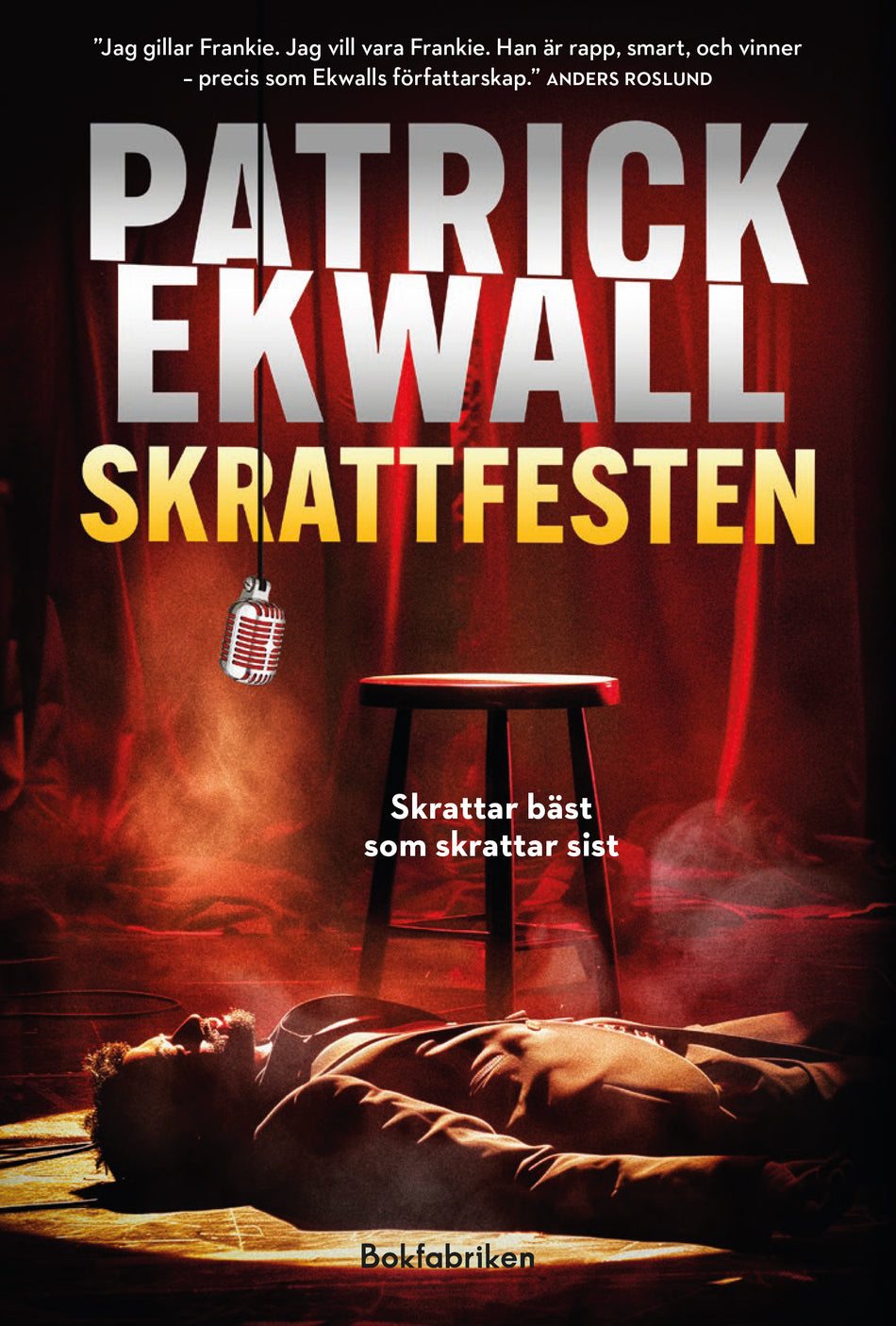 FRANKIE LARSSON håller sig undan på de paradisiska stränderna vid mexi­kanska gulfen. Men det är ett bedrägligt lugn. Ett ovälkommet besök hotar inte bara hans liv och framtid, utan även de han bryr sig allra mest om. Ett omskakande besked tvingar honom att återvända till Sverige.TV4-STJÄRNAN ANNELI ANCKARGREN har tagit över programledarrollen för omåttligt populära Let's Dance. För en gångs skull verkar allt gå enligt planerna. Tills programmets stjärna, handbollsidolen och kvin­nornas favorit, Pekka Puri försvinner spårlöst.STÅ UPP-KOMIKERN ÖSTEN ANDERSSON driver en framgångsrik klubb i centrala Stockholm och livet leker. De största stjärnorna uppträder och skratten fyller lokalen. Inget hade kunnat förbereda honom på det kaos som följer efter att en kändis hittas mördad bland publiken efter en lyckad show.GÅR DET ATT SKÄMTA OM ALLT när någon är fast besluten att ta livet av de som går för långt? Frankie Larsson tänker i alla fall se till att det är han som får sista skrattet.Skrattfesten är den andra fristående delen i serien om Frankie Larsson. Ständigt i händelsernas centrum brin­ner han för rättvisa och vackra kvinnor, är street smart och snäll, men farligare än någon anar, om han måste. »Det märks att Ekwall gjort sin läxa. Sällan har den svenska komikerbranschen skildrats så här spännande.«