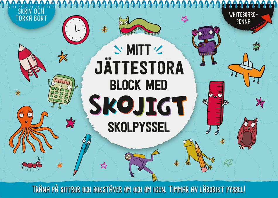 Gör dig redo för många timmars lärorikt pyssel! Det här superstora blocket är fullproppat av övningar och perfekt för dig som ska börja eller redan har börjat skolan. Träna på att räkna, stava och mycket annat när du gör bokens skojiga övningar med den medföljande pennan. När du är klar är det bara att torka av sidorna och börja om igen.Detta spiralbundna block i A3-format fungerar lika bra att sitta med vid köksbordet som på golvet. Den medföljande whiteboardpennan och de avtorkningsbara sidorna gör att övningarna går att göra om och om igen – vilket är perfekt när barnet till exempel behöver öva på att skriva stora och små bokstäver, siffror eller öva på geometriska figurer.
