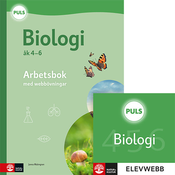 Arbetsbok med elevwebb Arbetsboken innehåller varierade uppgifter där eleven tränar ord och begrepp, befäster faktakunskaper och utmanas till vidare tänkande. Till arbetsboken hör självrättande webbövningar där eleven befäster ord och begrepp. 3D-bilder till arbetsboken Dina elever kan med hjälp av mobil eller surfplatta titta på tredimensionella bilder som är utvalda för PULS Biologi 4–6 arbetsbok. 3D-bilderna går att vrida och zooma in i för att eleverna ska kunna upptäcka detaljer och fördjupa sina kunskaper. Eleverna kan med hjälp av AR-teknik till exempel placera en bild av ett hjärta som pumpar på en klasskompis för att studera vad som händer i kroppen just nu. Dessutom finns quiz med frågor till varje kapitel. Puls 3D-bilder får ni tillgång till via appen Ludenso Explore. På första sidan i arbetsboken finns en QR-kod som eleverna skannar för att komma till materialet. Grundbok Digital Grundboken finns i digital version i en plattform med smarta funktioner för ett tillgängligt lärande. Innehållet är detsamma som i den tryckta boken men omges av ett gränssnitt och digitala funktioner som underlättar såväl läsning som inlärning, till exempel uppläst ljud. Prova kostnadsfritt i 30 dagar. Paket Bok + Digital Grundboken till PULS Biologi finns nu även som ett paket där du köper boken och får tillgång till den digitala versionen i 12 månader utan extra kostnad. Lärarhandledning med lärarwebb Lärarhandledningen innehåller fördjupande fakta, didaktiska tips, frågeställningar, förslag på aktiviteter och begreppsförklaringar. Den ger dig stöd för att aktivera elevernas tänkande, arbeta praktiskt samt språk- och kunskapsutvecklande. På den tillhörande lärarwebben finns material för digital visning som stöd till din undervisning i klassrummet. Vid köp av lärarhandledningen ingår ett års licens till lärarwebben. Efter 12 månader kan du förnya ditt abonnemang och köpa webben separat. PULS Biologi, äldre upplaga PULS Biologi, tredje upplagan utkom 2012. Till varje grundbok finns en arbetsbok och en lärarbok. På webben finns extramaterial med elevövningar och facit. Böckerna finns kvar för kompletteringsköp så länge lagret räcker.
