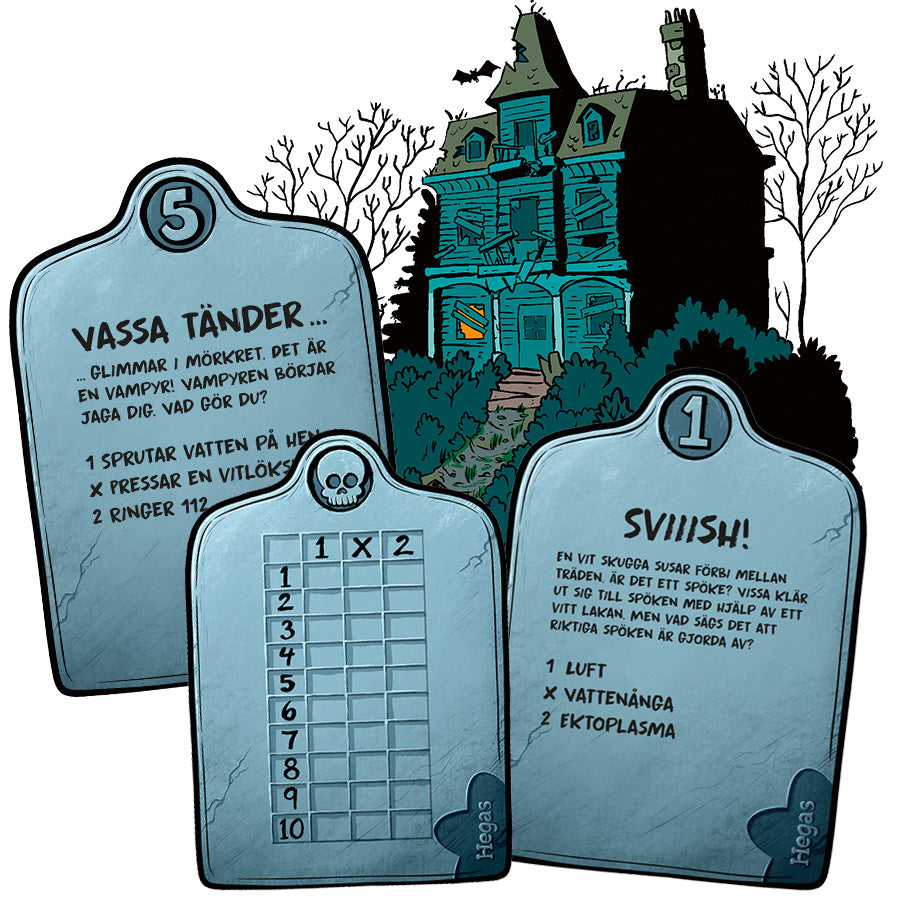 I sann ryslig Robin Spököga-anda kan du nu beställa vår gruvliga tipsrunda. Du får 11 skyltar med frågor om gastar, monstrer och rysligheter.