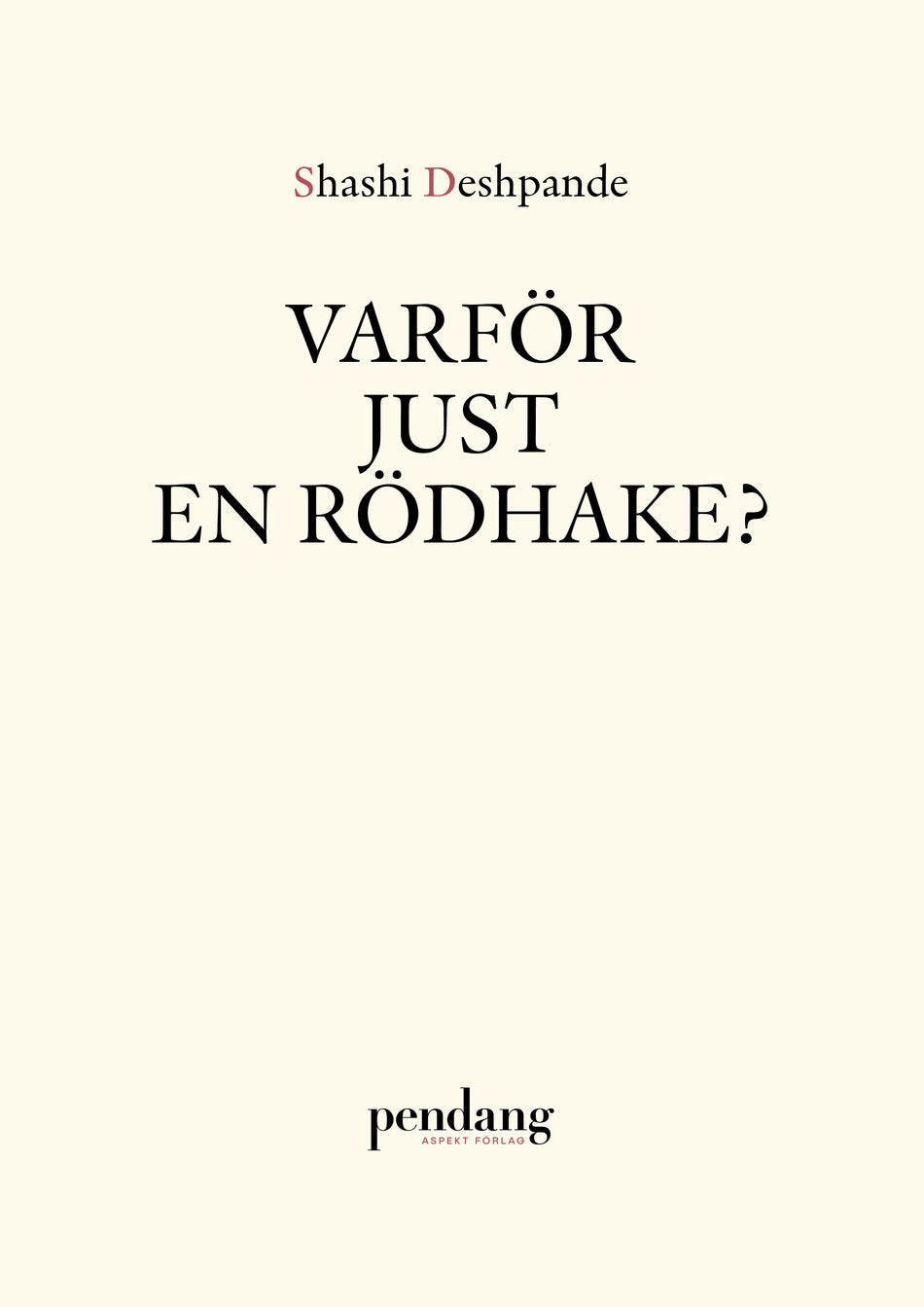 I Varför just en rödhake? får vi korta, intensiva inblickar i tre olika kvinnors liv. Trots utanförskap och isolering upphör de inte att försöka nå fram till sina närmaste. Deshpande skildrar kvinnorna med ett språk som låter oss komma dem nära och se världen genom deras ögon. Vi blir ett med dem, hör deras tankar som om de var våra egna och blir djupt berörda. Shashi Deshpande (f 1938 i Dharwar, Indien) debuterade som författare i slutet av 1970-talet. Hon har gett ut ett tiotal romaner, flera novellsamlingar och även några barnböcker. Hennes mest kända roman, That Long Silence (1989), tar upp kvinnans ställning i Indien och betraktas som en milstolpe inom landets engelskspråkiga litteratur. Novellerna i Varför just en rödhake? är hämtade ur samlingen The Intrusion and Other Stories (1993).