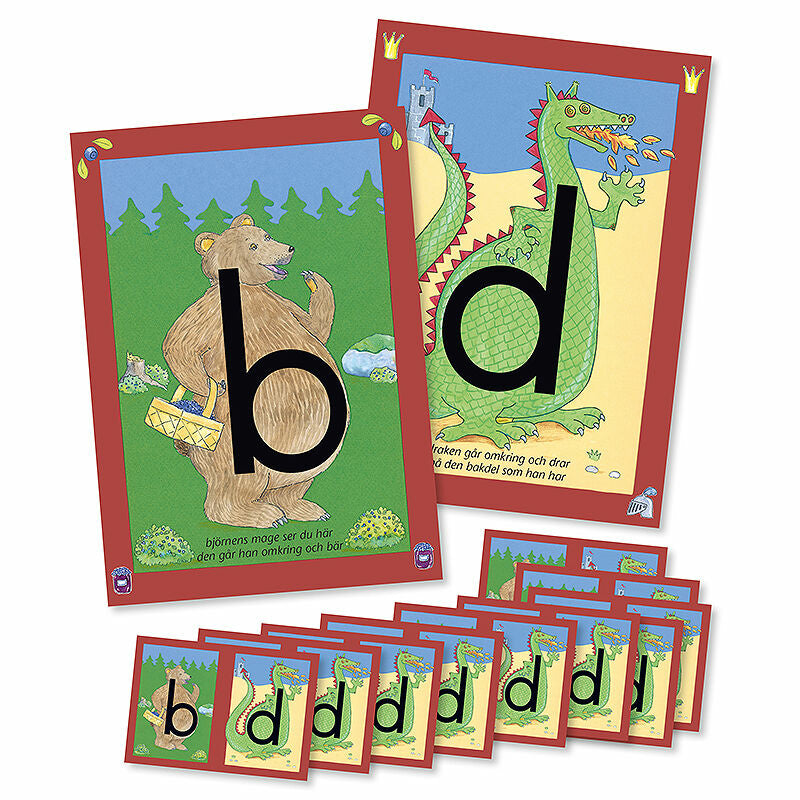 Många barn har svårt att skilja b och d åt, då de ser så lika ut. Med dessa två planscher i A4-format, påminns barnen om att ”björnen bär men draken drar”. Tio stycken småkort följer med, lämpliga att sätta på bänken som extra stöd.