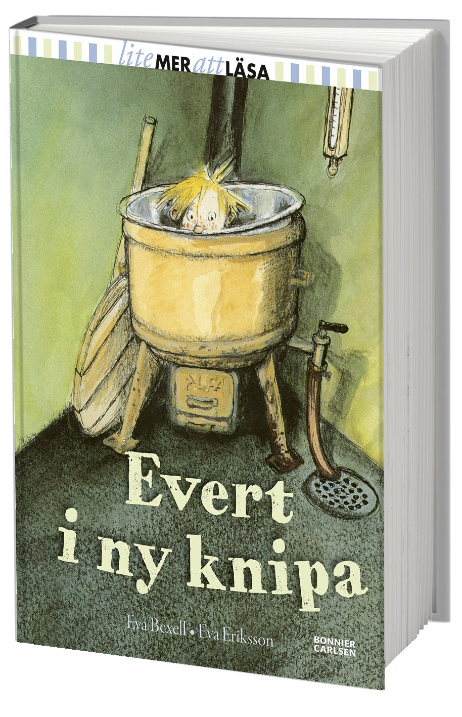 Skolan har just börjat efter sommarlovet och Evert är på väg hem med sin kompis Hans-Olof. Det som börjar som en härlig eftermiddag – med drömmar om utflykter med bilen som Everts familj snart ska köpa – slutar i katastrof. De hittar en "död" Albin Andersson! Och när ryktet om vad som hänt sprids i stan väntar ännu en olycka. Hur ska killarna kunna ställa allt tillrätta?Eva Bexells roliga böcker om Evert är kära klassiker som illustrerats av Eva Eriksson med härligt humoristiska bilder i svartvitt. "Evert i ny knipa" utkom första gången 1992, men historien tilldrar sig i en svunnen tid, då man fortfarande niade varandra och med lite tur kunde bjudas på bröstkarameller av handlaren på Konsum! Utkommer samtidigt med "Olycksfågeln Evert" i serien Lite mer att läsa. Perfekt för läsaren som vill ta steget från Lätt att läsa, och som gillar Eva Bexells böcker om morfar Prosten.