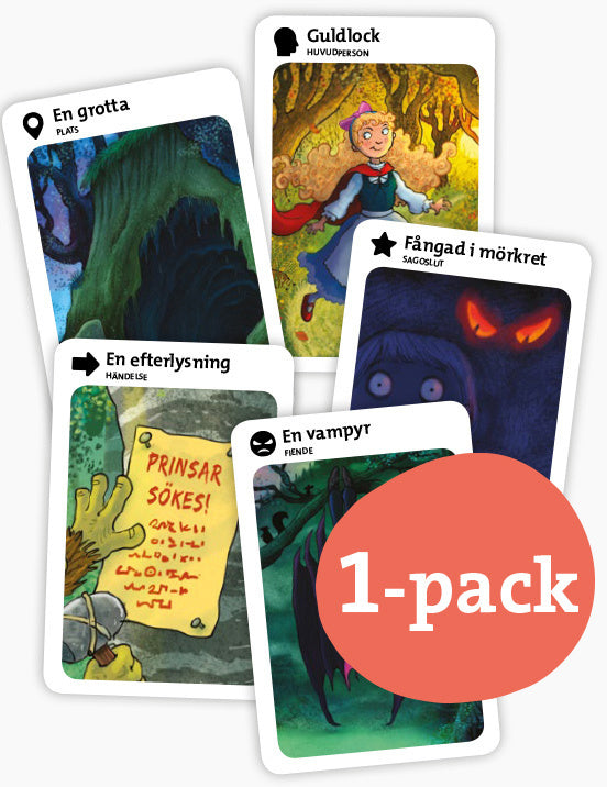 Hur funkar spelet? Skruvade sagor går ut på att sampla kort tills man har en komplett saga. Alla spelare börjar med 5 kort. Varje runda får var och en slänga ett kort och dra ett nytt från den nedåtvända draghögen. När en spelare har samlat alla delar i en saga – ett kort av varje sort: huvudpersonskort, platskort, fiendekort, händelsekort och sagoslutskort – då ska den berätta en saga utifrån korten. Sedan börjar en ny spelomgång. Vinnaren är den som först berättar tre sagor!