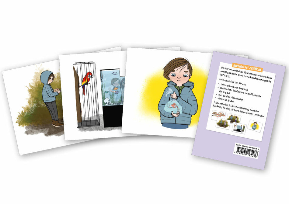 Krumelurkul 2 Bildkort innehåller illustrationer till samtliga kapitel i läseboken samt illustrationer med huvudkaraktärerna Otis och Luna, deras familjer, ögonfransgeckon Örjan, läraren Åsa, grannen Maria och hennes hund Hero. Totalt 107 kort med illustrationer ger många möjligheter till att exempelvis: • träna på ord och begrepp • återberätta läsebokens innehåll, kapitel för kapitel • öva på den röda tråden • skriva till bilder. I Krumelurkul 2 Lärarhandledning finns fler konkreta förslag till hur bildkorten kan användas.