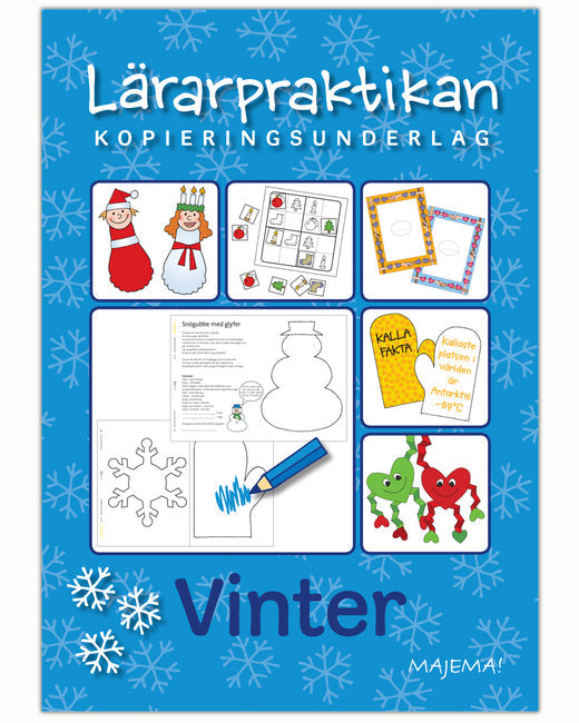 I Lärarpraktikan vinter hittar du handledning med en mängd idéer och förslag på teman som anknyter till vintern på olika sätt, samt arbetsblad som kopieringsunderlag. Här finns också tips på hur du på ett årstidsanknutet sätt kan visa upp elevarbeten på anslagstavlor och väggar. Exempel på teman är: Advent och jul, Nobeldagen, Nytt år, Kompisdag. Handledningen är i färg och kopieringsunderlagen i svartvitt.