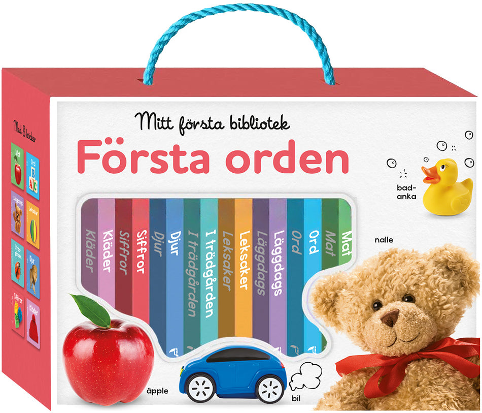Mitt första bibliotek: Första orden innehåller åtta stadiga pekböcker med tydliga, färgstarka bilder på saker som finns i vardagen. Det är både roligt och lärorikt för barnet att titta, peka och lära sig nya ord och koncept som siffror, koppling mellan ord och bild, samtidigt som ordförrådet utök... Lue lisää