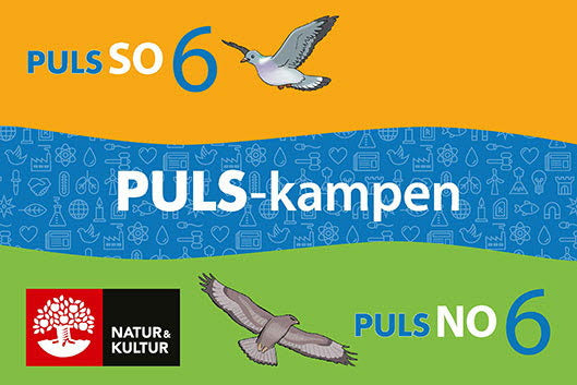 Grundboken till PULS finns nu även som ett paket där du köper boken och får tillgång till den digitala versionen i 12 månader utan extra kostnad. Arbetsbok med webbövningar Arbetsboken innehåller varierade uppgifter med tydlig progression. Eleven får träna ord och begrepp, befästa faktakunskaper och utmanas till vidare tänkande. Till arbetsboken hör självrättande webbövningar där eleven befäster ord och begrepp. Facit till arbetsbokens uppgifter finns på lärarwebben. Lärarhandledning med lärarwebb Undervisningen med PULS utgår från lärarhandledningen. Här finns tydlig vägledning för hur du kan ta reda på elevernas förkunskaper, skapa intresse, aktivera elevernas tänkande, arbeta språk- och kunskapsutvecklande samt följa upp arbetet. Lärarhandledningen stöttar läraren lektion för lektion – hela vägen fram till bedömning. På den tillhörande lärarwebben finns material för digital visning, facit till arbetsbokens uppgifter, förslag på lärmål för varje avsnitt samt duggor och fördjupande uppgifter som stöd för bedömning av elevernas kunskaper. På lärarwebben ligger även digitala versioner av såväl grundboken som lärarhandledningen. Vid köp av lärarhandledningen ingår ett års licens till lärarwebben. Efter 12 månader kan du förnya ditt abonnemang och köpa webben separat. PULS-kampen I vilken klimatzon ligger den största delen av Sveriges landyta? Vilken metall är en blandning av koppar och tenn? I vilka två länder lever de flesta hinduer idag? Vad kallas de material som inte är bra på att leda elektricitet? I spelet PULS-kampen får eleverna ta pulsen på sina kunskaper i SO och NO. Varje kortlek innehåller 364 allmänbildande faktafrågor hämtade från PULS åk 6. Spelplan laddas ner kostnadsfritt från nok.se/puls/materialbank men spelen kan också spelas utan spelplan. Innehåll PULS SO årskursböcker innehåller ca tio kapitel/årskurs fördelade mellan ämnena samhällskunskap, geografi, religionskunskap och historia.