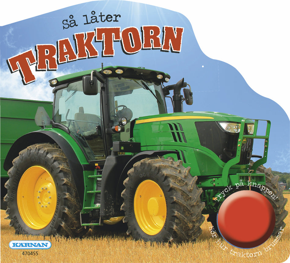 Ljudbok med ljud som låter som en traktor som accelererar och sedan kör i väg. Barnet kan titta på bilder av traktorer som plöjer, tröskar, lastar med mera.