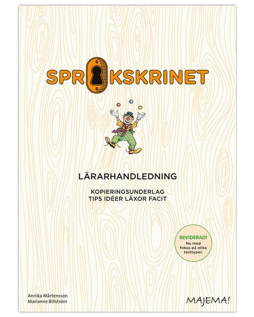 I Språkskrinet clown lärarhandledning finns konkreta förslag på hur du kan inleda din lektion och undervisa kring det som ska läras. Läxor/öva mer finns som kopieringsunderlag. Facit för grundboken ingår. En stor del av lärarhandledningen har konkreta förslag på hur du kan jobba med varje uppslag i elevboken. Se några korta förslag nedan. Ordkunskap - Varje kapitel inleds med en bild eller tankekarta. Utgå från bilden, samtala och låt eleverna berätta och associera. Därefter arbetar eleverna i sin bok. Språklära - Inled med en genomgång av det som ska övas, exempelvis adjektiv, ng-ljudet, homonymer. Förslag på inledningar finns i lärarhandledningen. Skrivning - Här planerar eleven sin egen berättelse genom att skriva stödord. Uppmuntra eleven att "läsa" berättelsen utifrån stödorden för en kamrat. Skrivuppgiften knyter alltid an till det man arbetar med i kapitlet. Språkskrinet Lärarhandledning clown är en handledning som hör till Språkskrinet clown. Språkskrinet är en serie böcker i svenska som sträcker sig från årskurs 1-6.