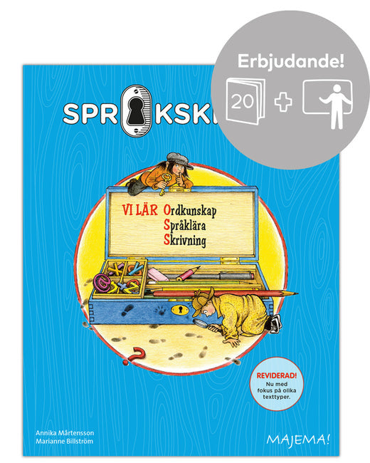 Språkskrinets grundböcker gör sig allra bäst tillsammans med lärarwebben där du kan visa varje övning i grundboken i storformat, något som gör dina genomgångar och uppföljningar så mycket tydligare och enklare. Språkskrinets detektiv åk 3 paket består av 20 grundböcker samt en lärarwebb.