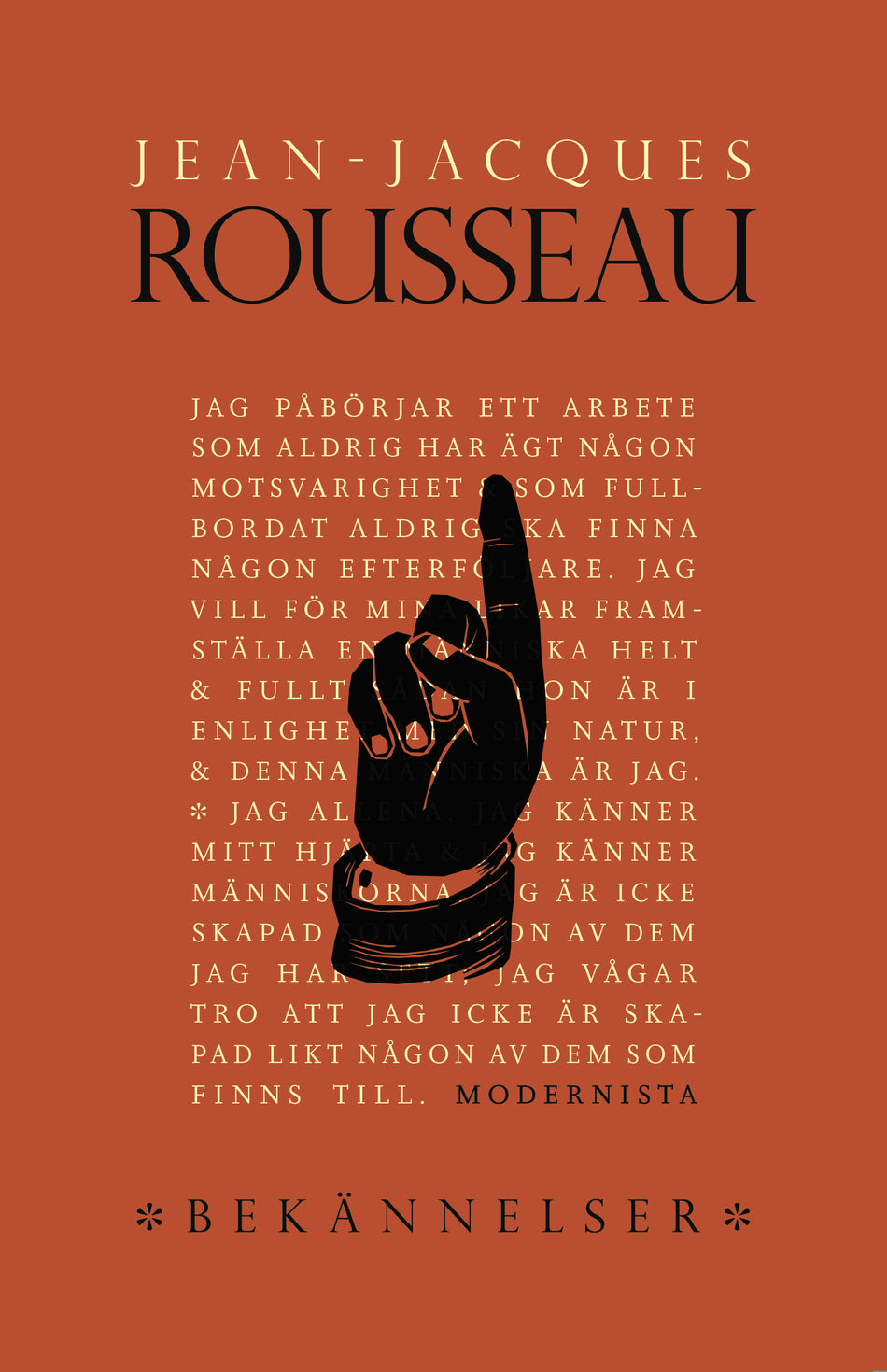 I översättning av David Sprengel. JEAN-JACQUES ROUSSEAU [1712-1778], född i Genève, var en schweizisk-fransk författare, filosof och kompositör. Den politiska filosofi han utvecklade kom att bli central för den europeiska upplysningen under 1700-talet, och flera av de filosofiska och ideologiska tankar han redogör för betraktas nu som hörnstenar inom modernt politiskt tänkande. Sexton år efter sin död flyttades hans kvarlevor till Panthéon, där han nu vilar mittemot Voltaire.