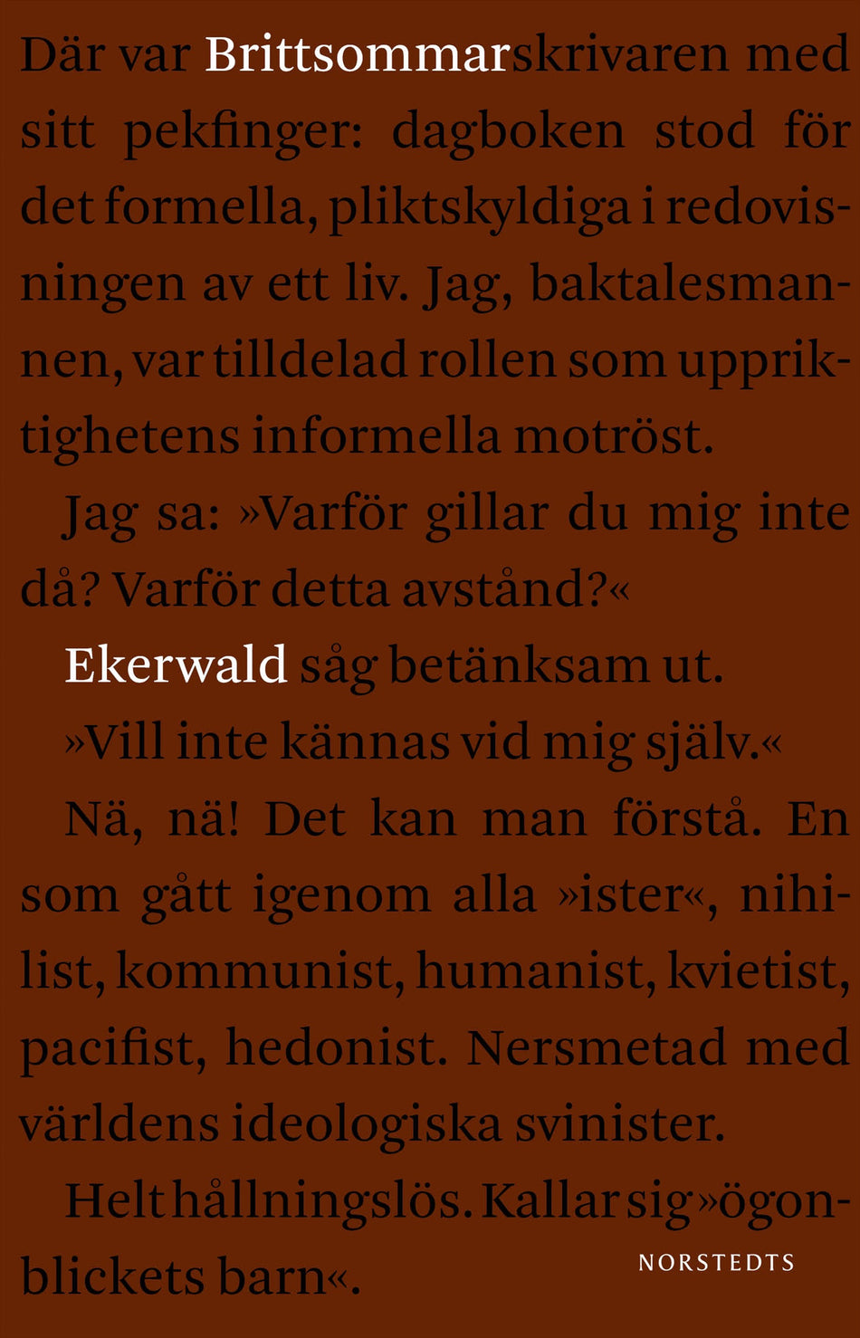Den som för ordet är Carl-Göran Ekerwalds "baktalesman". Brittsommar är tredje delen i Ekerwalds svit av självbiografiska böcker men liknar till formen inget han skrivit tidigare. Boken ger utrymme åt två röster, en dagbok författad mellan åren 2009-2018 av Ekerwalds "talesman". Han noterar bara vad han tycker är lagom: resor, möten med människor, möten med böcker, möten med drömmar. Efter dagboken följer baktalesmannens kritiska och upplysande kommentarer med överskrifter som "Mozartbreven", "Goethes kokerska", "Beuys och den persiska estetiken" och "Att föreställa sig Gud". De blir till ett slags miniessäer om ett liv av läsande och skrivande. Vart ledde det, vad har han lärt sig, vad var viktigt?