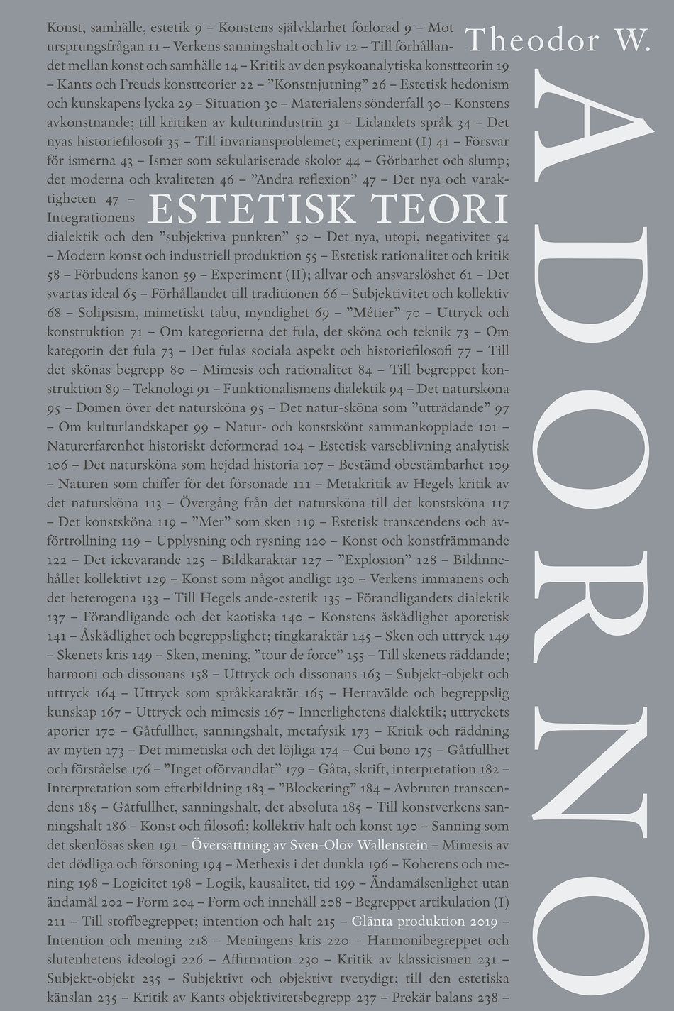Estetisk teori var vid Adornos död ofullbordad. Det hindrar inte att boken idag framstår som hans kanske viktigaste och mest inflytelserika verk. Här blickar han tillbaka mot decennier av arbete med konstarterna och den filosofiska estetiken som den utvecklats sedan den tyska idealismen. I centr... Lue lisää