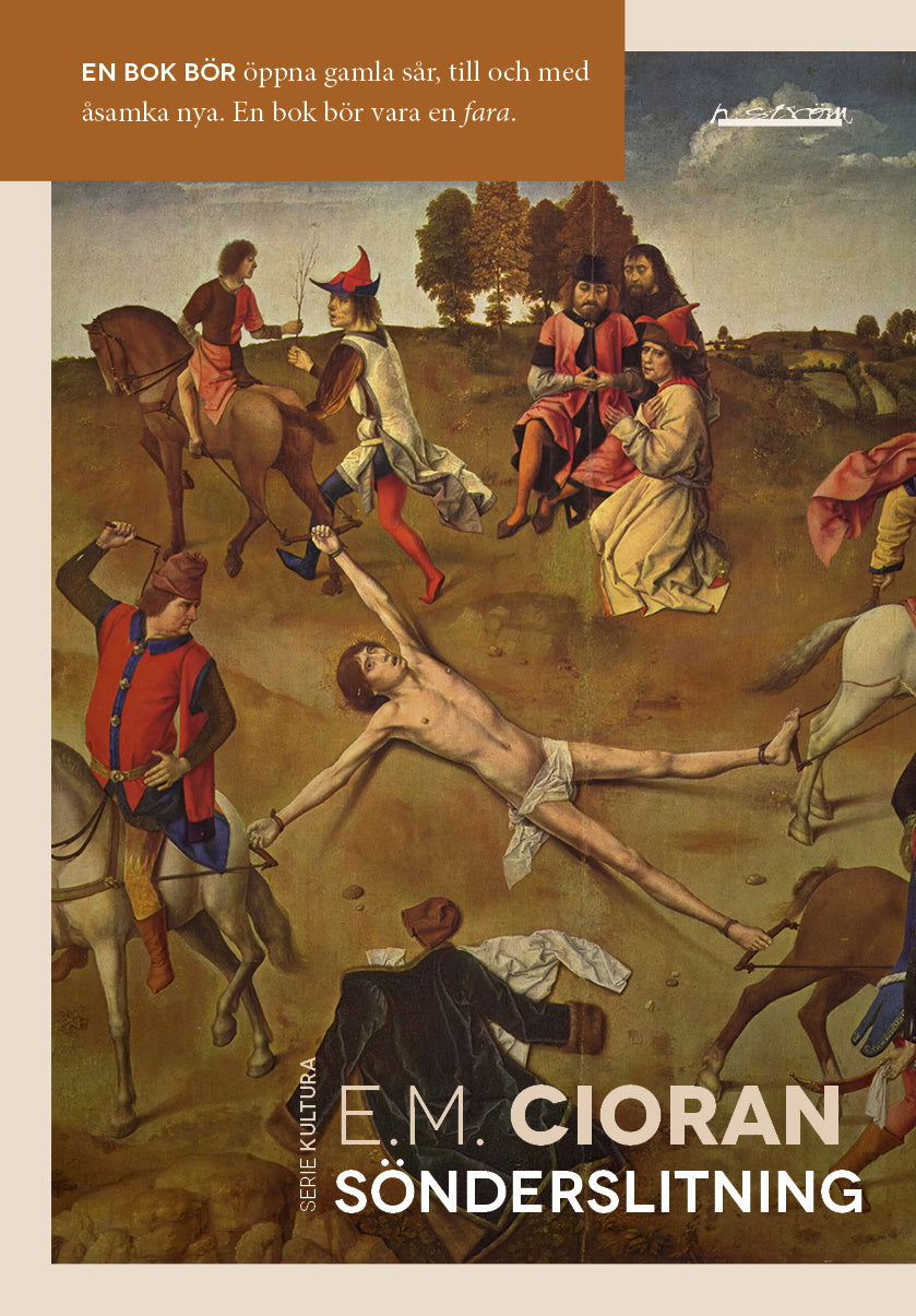 Hur dystert Ciorans tänkande än kan tyckas vara, leder hans reflektioner över tillvarons grundvillkor inte fram till något försök att bevisa tillvarons meningslöshet, utan handlar snarare om att använda svärtan, som reflektionen över existensens grundvalar inrymmer, som ett redskap för att väcka kärleken till livet. Sönderslitning (1979) är ett karaktäristiskt verk. I en blandning av essäistik och aforistik får vi ta del av en serie reflektioner över hans återkommande teman: historien och Västerlandets förfall, självmordets lockelse, sömnlöshetens prövningar, den moderna akademiska filosofins värdelöshet, framhållen i jämförelser med Buddha, några kristna helgon och ett litet antal tänkare som Pascal, Marcus Aurelius och Epikuros. Stilen är sedvanligt kristallklar, helt skyende all fackfilosofisk terminologi. Idéhistorikern Tobias Dahlkvist, författare till flera böcker om pessimismens historia, däribland Eremiten i Paris: Emil Cioran och pessimismen som levnadskonst (2013), har försett boken med ett initierat efterord. "Detta är Cioran-högtid. Detta är en bok som självklart bör stå bland de få som finns till hands bredvid sängen (där också en handfull andra centrala verk av andra författare finns)." - Thomas Nydahl, NYDAHLS OCCIDENT.