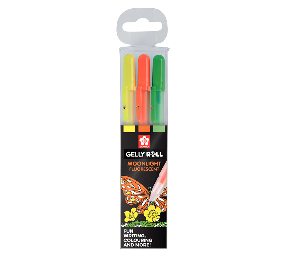 Sakuran Moonlight Happy -lajitelmassa on kolme fluoresoivaa geelikynää: vihreä, oranssi ja keltainen. Vesiliukoinen pigmenttimuste on vedenkestävä ja haalistumaton. Moonlight-kynien jälki sopii erityisen hyvin tummalle paperille. Medium-kärki 0,4 mm. Lue lisää