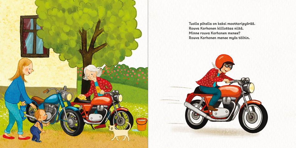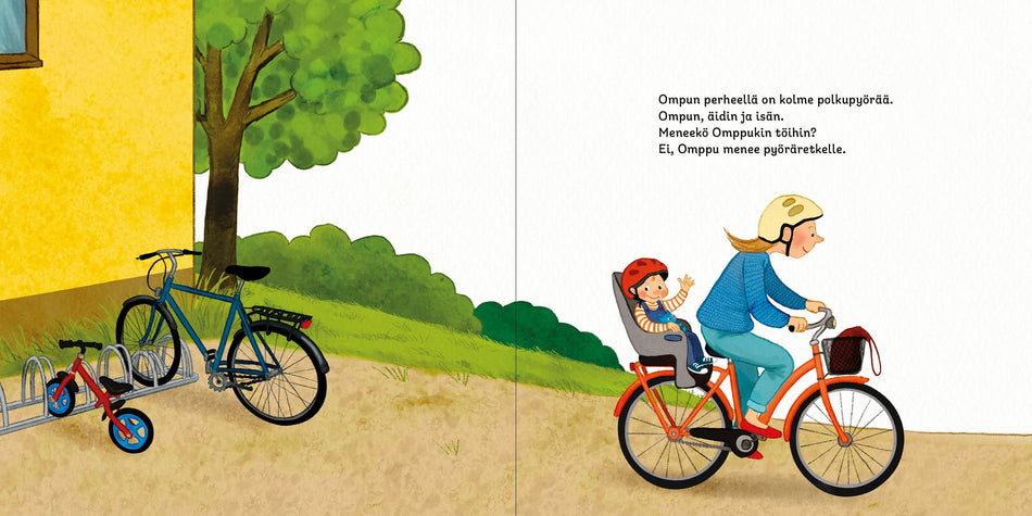Pyöräretkellä Omppu näkee vaikka minkälaisia kulkupelejä. Naapurin sedän auto ja rouva Korhosen moottoripyörät, kaivinkone työmaalla, bussi ja juna matkustajineen. Kaikki ovat menossa jonnekin, mutta minne?