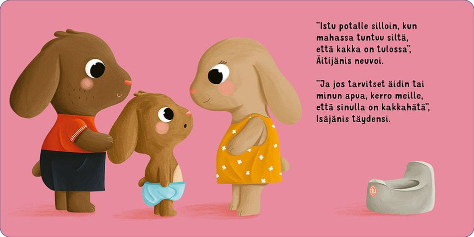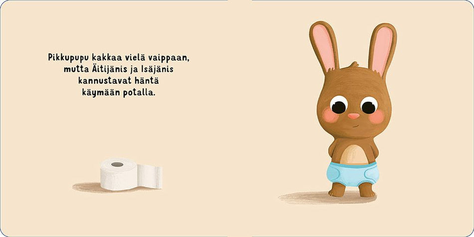 Pikkupupun on aika oppia käymään potalla. Äitijäniksen ja Isäjäniksen avulla se onnistuu! Mutta mitä kakalle tapahtuu sen jälkeen, kun se on päätynyt pottaan? Lämminhenkinen ja humoristinen katselukirja toimii tukena uuden opettelussa. Lue lisää