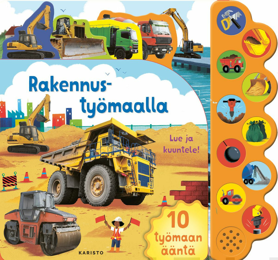 Rakennustyömaalla jyrisee ja paukkuu. Opi tunnistamaan työmaan koneita ja kuuntele niiden ääniä painamalla ääninappeja. Samalla voit lukea tietoa työkoneista. 10 ääninappia.