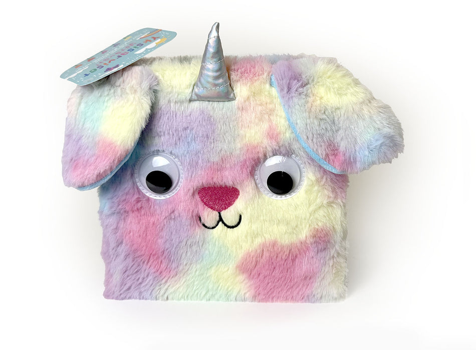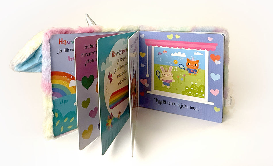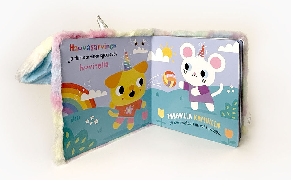 Pehmeän pöyheä kirja täynnä yksisarvisten ystäviä.