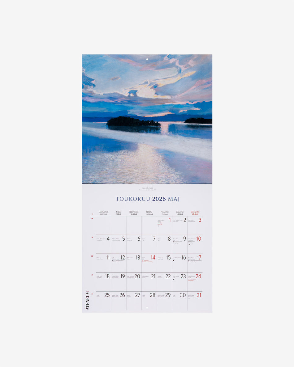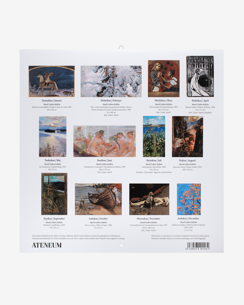 Pidä arki järjestyksessä Akseli Gallen-Kallela -seinäkalenterin avulla! Vuoden 2026 taidekalenteriin on koottu kuvia Akseli Gallen-Kallelan teoksista. Kannessa on teoskuva maalauksesta Talvi, esityö Juseliuksen mausoleumin freskoa varten. Lue lisää