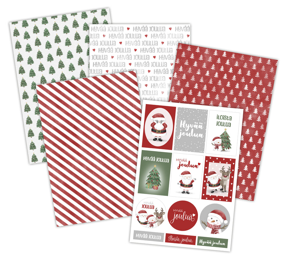 Kartonkilajitelma askarteluun ja koristeluun. Pakkaus sisältää kahdeksan arkkia A4-kokoisia kuviokartonkeja sekä kaksi A4-kokoista arkkia valmiiksi leikattuja kartonkisia tekstikuvioita. Pakkauksessa on neljä erilaista kuviokartonkia, kaksi kappaletta per kuosi. Kartongin vahvuus on 160g/m².