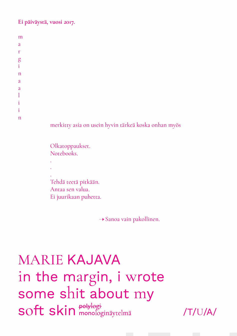 in the margin, i wrote some shit about my soft skin -näytelmä pohjaa näytelmäkirjailija Marie Kajavan parinkymmenen vuoden aikaisiin muistiinpanoihin, työpäiväkirjoihin, hatariin merkintöihin marginaaleissa, kohtauksiin jotka eivät ole päätyneet esityksiin, post it -lappuihin ja unohtuneeseen roskaan. Kaikesta tuosta syntyi monologinäytelmä, joka perustuu tähän dokumentaariseen materiaaliin sellaisena kuin se on: virheellisenä, rihmastollisena, kauniina, arvaamattomana.