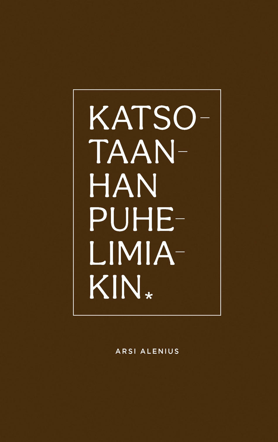 Meillä on käytössämme ehkä maailman paras kirjastolaitos, miten te kehtaatte olla noin sivistymättömiä? Arsi Aleniuksen Katsotaanhan puhelimiakin on hurja monologi ja hullun palavasieluinen saarna, joka näkee kirkkaasti myöhäiskapitalistisen maailman järjettömyyden. Se rikkoo kirjallisen tuopin lukijan naamaan ja kysyy mikset ole jo lukemassa kirjoja tai tekemässä tälle kaikelle jotain!