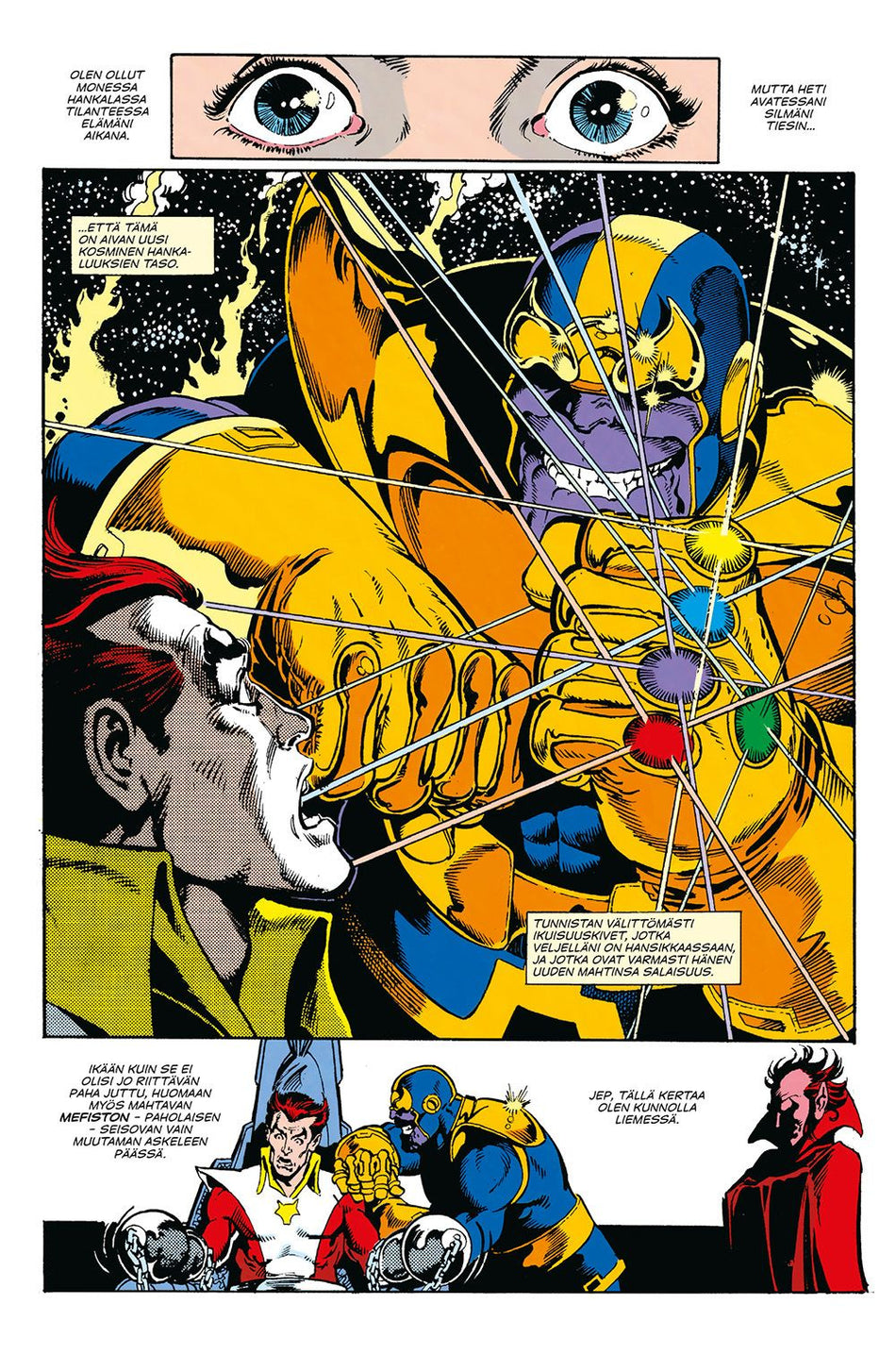 Julma titaani Thanos on saanut haltuunsa kaikki kuusi ikuisuuskiveä. Luomallaan "ikuisuuden rautahanskalla" hän hallitsee todellisuutta ja on valmis suunnattomiin hirmutekoihin miellyttääkseen valtijatartaan, Kuolemaa. Pystyvätkö maailman mahtavimmatkaan sankarit pysäyttämään Thanoksen? Jim Starl... Lue lisää