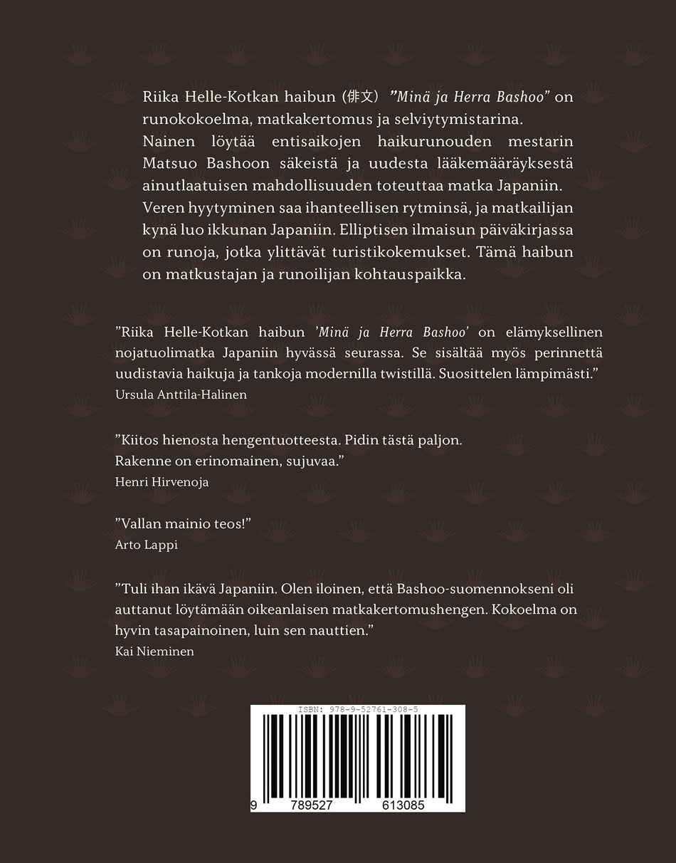 Riika Helle-Kotkan haibun () ”Minä ja Herra Bashoo” on runokokoelma, matkakertomus ja selviytymistarina.