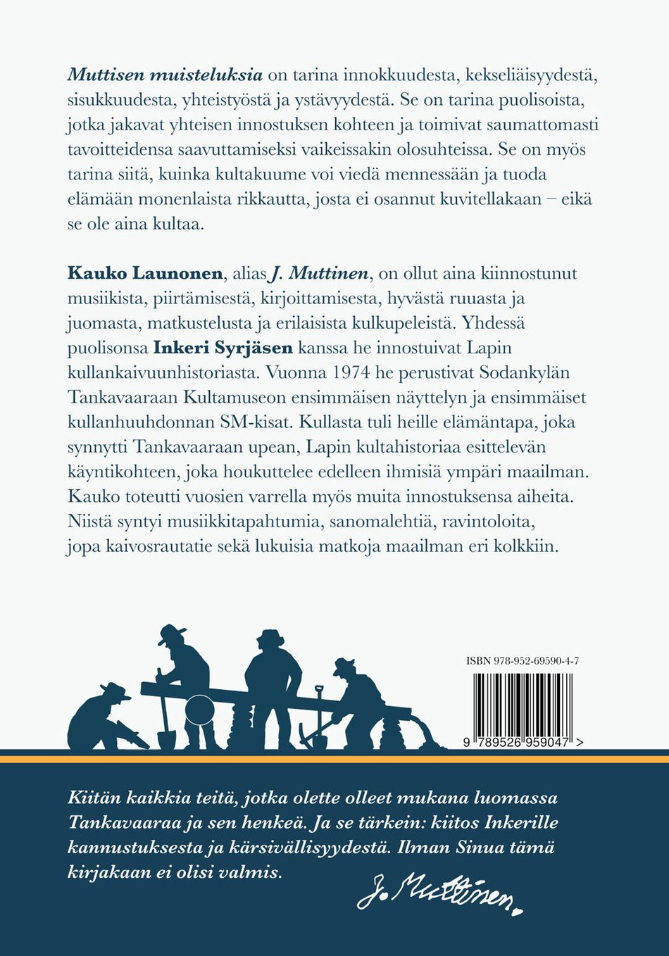 Kauko Launonen, alias J. Muttinen, on ollut aina kiinnostunut musiikista, piirtämisestä, kirjoittamisesta, hyvästä ruuasta ja juomasta, matkustelusta ja erilaisista kulkupeleistä. Yhdessä puolisonsa Inkeri Syrjäsen kanssa he innostuivat Lapin kullankaivuunhistoriasta. Vuonna 1974 he perustivat Sodankylän Tankavaaraan Kultamuseon ensimmäisen näyttelyn ja ensimmäiset kullanhuuhdonnan SM-kisat. Kullasta tuli heille elämäntapa, joka synnytti Tankavaaraan upean, Lapin kultahistoriaa esittelevän käyntikohteen, joka houkuttelee edelleen ihmisiä ympäri maailman. Kauko toteutti vuosien varrella myös muita innostuksen aiheita. Niistä syntyi musiikkitapahtumia, sanomalehtiä, ravintoloita, jopa kaivosrautatie sekä lukuisia matkoja maailman eri kolkkiin.