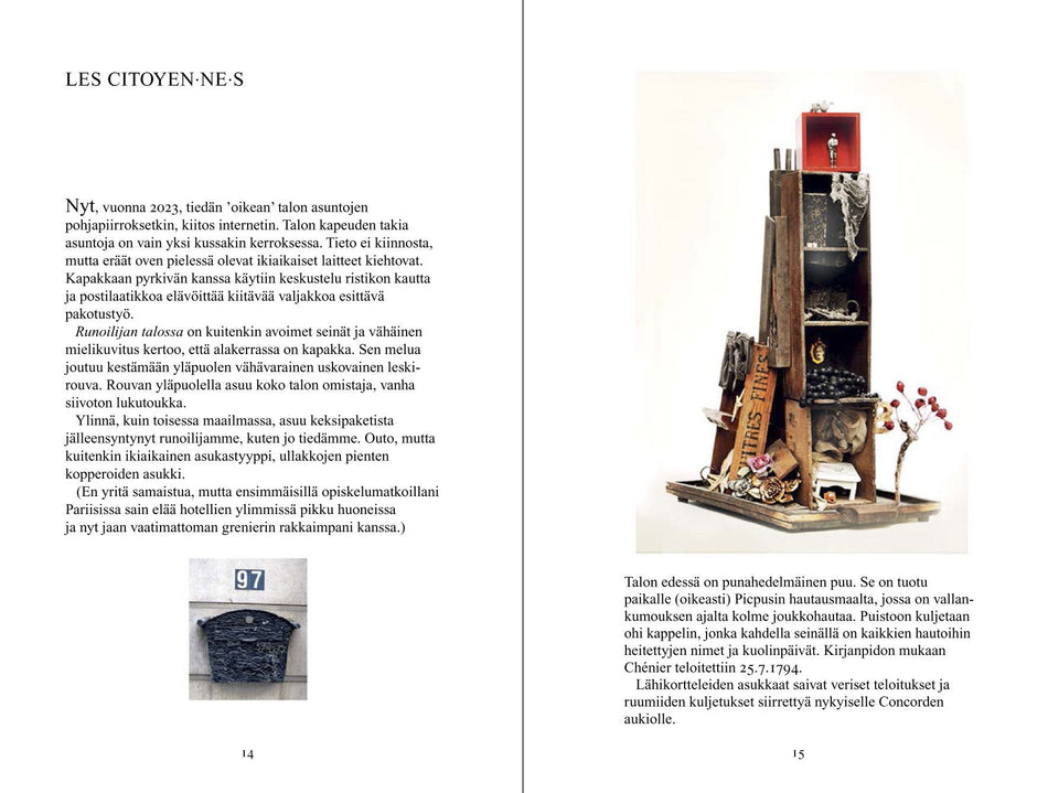 Istuin Pariisin asunnossamme moniaat ajat yksin aamukahvipöydässä, lounaspöydässä ja illallispöydässä katsellen keittiön nurkassa olevaa laatikkokasaa. Pohtien, ilman pakkoa, vastuussa vain kutsumukselleni tehdä taidetta. Laatikoistakin. ”Runoilijan talo” on työnä edelleen edustava monessa mielessä. Se on synteesi tekemisteni tärkeimmistä linjoista. Se on kauneuden etsimistä esineyhdistelmistä, oudoistakin.