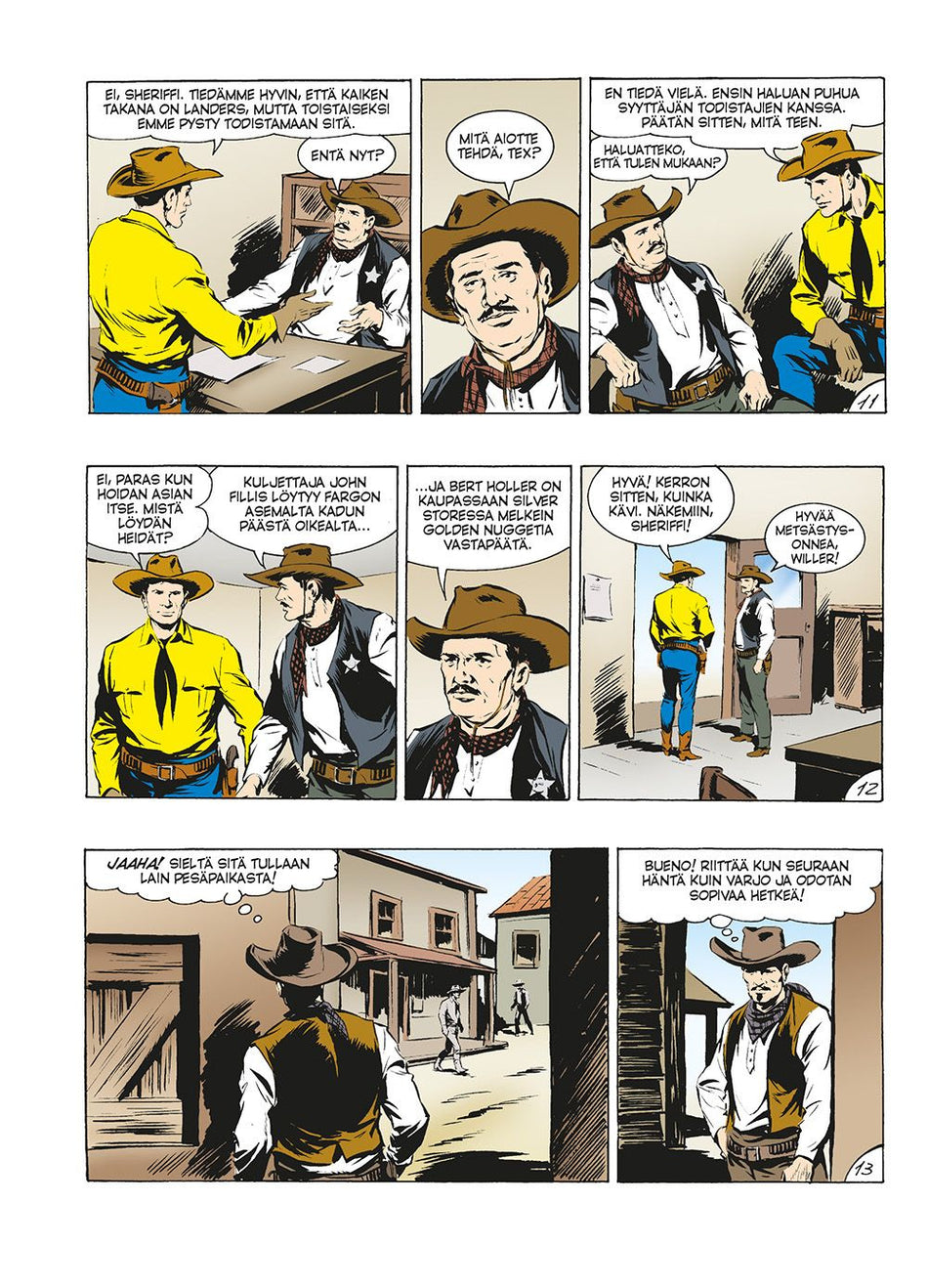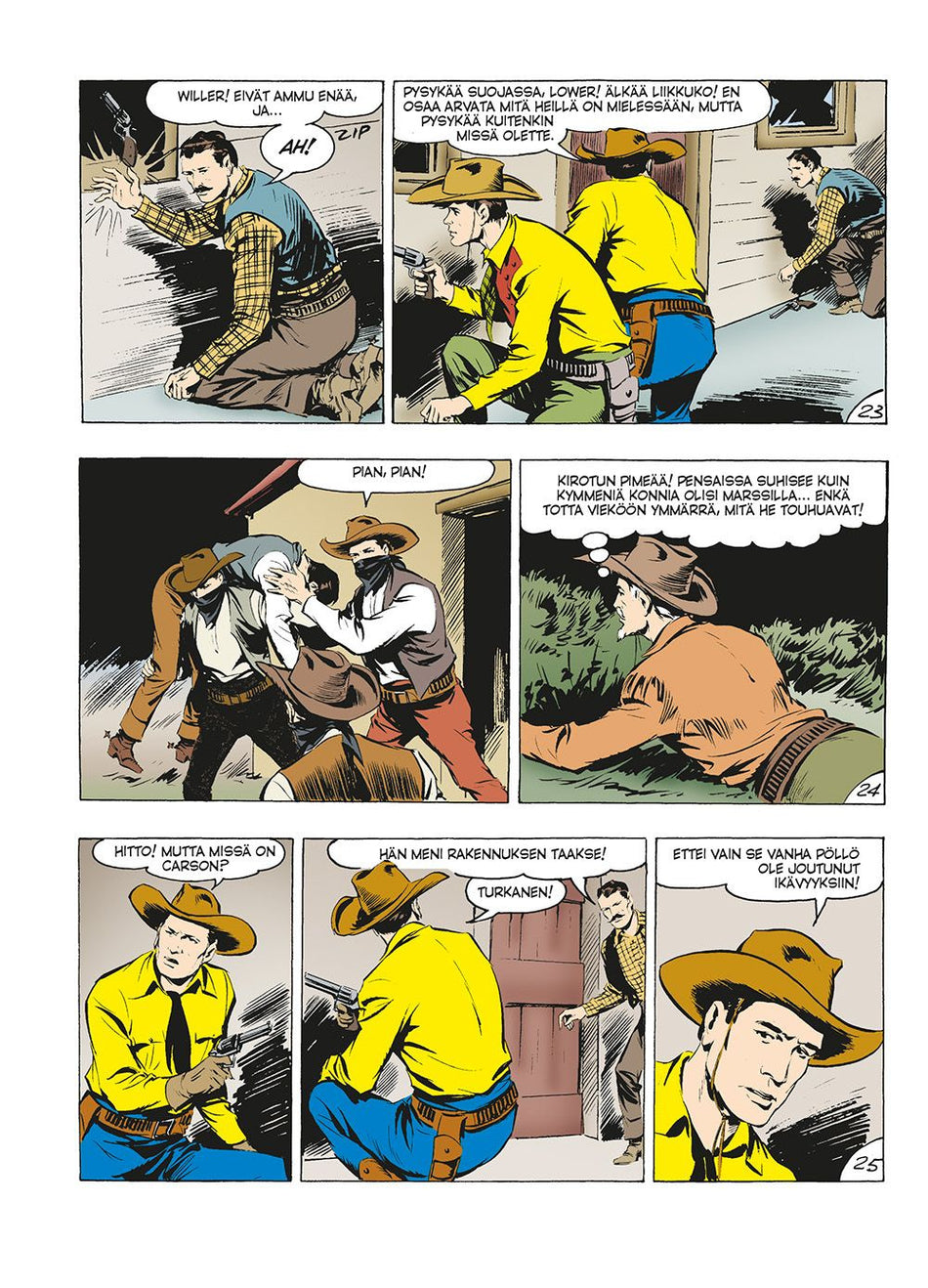 Las Vegasissa Tex saa vastaansa Jim Landersin, katalan tyypin, jonka johtamat karjapaimenet ovat kovia miehiä ja hyviä ampujia. Las Vegasin jälkeen Tex suuntaa San Rafaeliin, mutta matkalla hän saa kimppuunsa pueblointiaanin, joka ennen kuolemaansa lupaa Texille veristä kostoa salamyhkäisen ”Must... Lue lisää