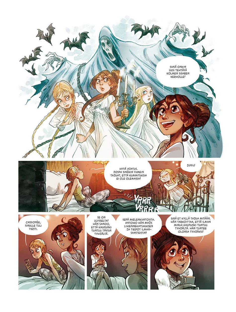 Kesäloma on viimein koittanut! Joka vuosi Sarah, Cassiopée ja Lucille matkustavat kesäksi isoäitinsä luo pieneen maalaiskylään. Kylässä heitä odottavat jo tutut kaverit, leppoisa tunnelma - sekä kummitus! Levoton henki vaeltaa järvenrannan vanhassa rauniokirkossa. Mistä se on tullut? Mikä on sen salaisuus? Ja miksi se soittaa öisin kirkonkelloja? Asiaa ryhtyy selvittämään kolmen sisaren kerho!