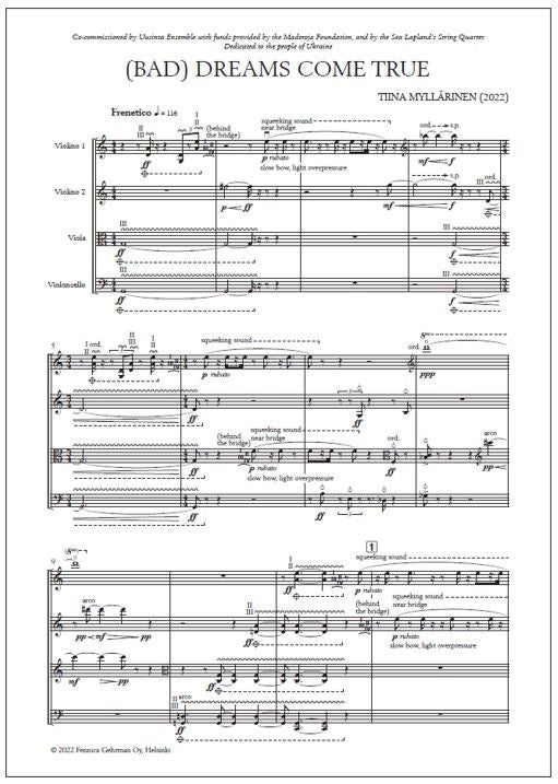 Tiina Myllärinen's (b. 1979) (Bad) Dreams come true for strings quartet (2022) was composed when war broke out in Europe. The composer tells: "The shock, and the daily news barrage of battles could not help making an impression on my work and its material. I wondered what dreams and plans people ... Lue lisää
