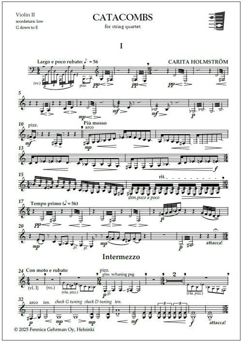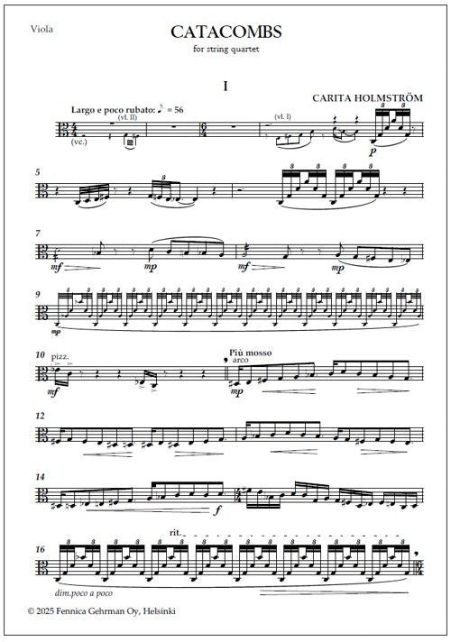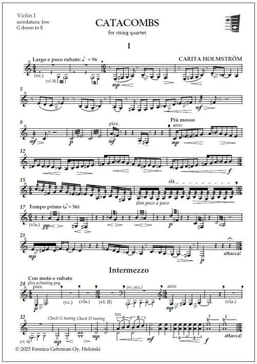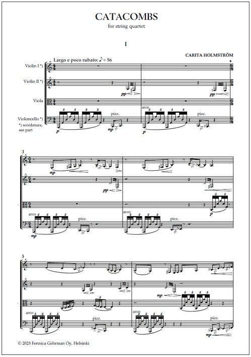 The inspiration for Catacombs (2005), a string quartet by Carita Holmström came from her visit to the two-thousand-year-old catacombs, where the Christians of that time were hiding from the Roman persecution. The composer tells: "The atmosphere and history of that place gave me the idea to tell t... Lue lisää