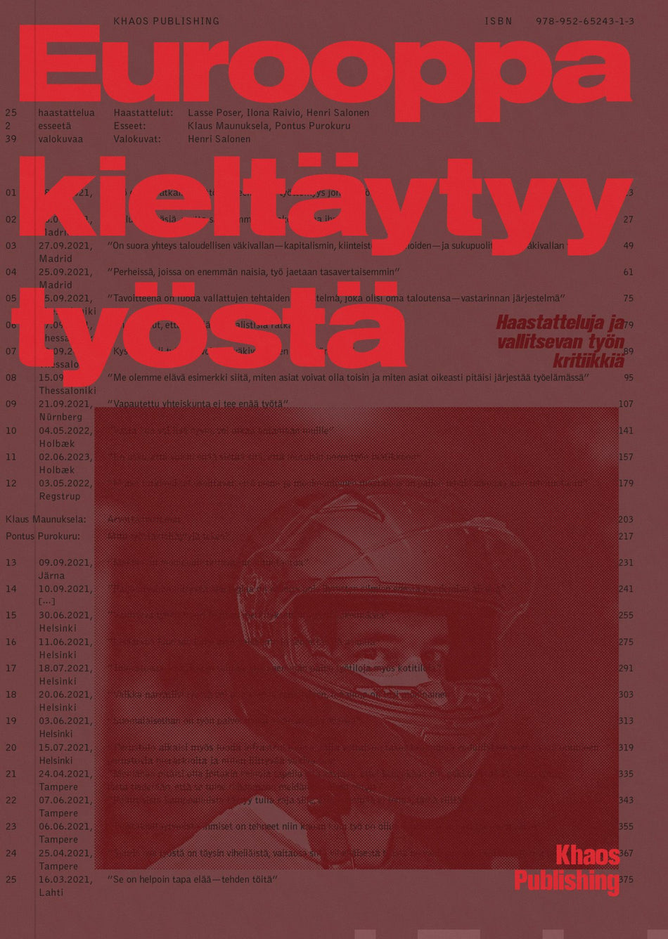 Eurooppa kieltäytyy työstä - Haastatteluja ja vallitsevan työn kritiikkiä sisältää 25 haastattelua ja kaksi esseetä, joissa käsitellään työstäkieltäytymisen ja työn kultin käsitteitä, työn toisin organisoimisen mahdollisuuksia sekä seuraavia mahdollisia askelia taistelussa autoritaarista ja orjuu... Lue lisää