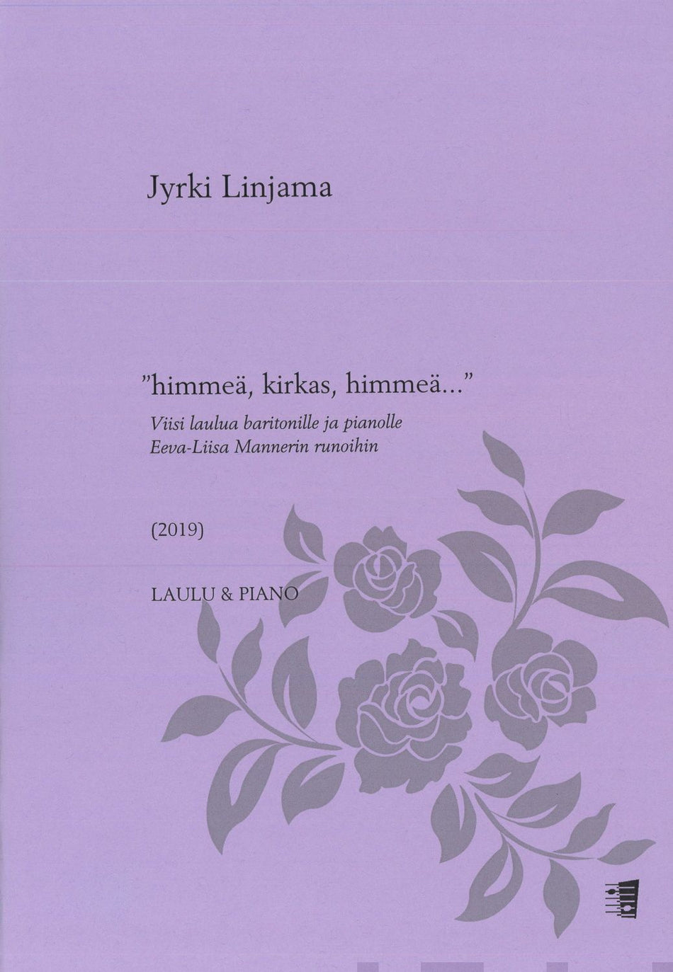 Jyrki Linjama's (b. 1962) poetic music finds its counterpart in the poems of an important Finnish modernist Eeva-Liisa Manner (1921-1995). The song cycle ”himmeä, kirkas, himmeä...” consists of five songs and was commissioned and premiered by baritone Aarne Pelkonen and pinist Juho Alakärppä in N... Lue lisää