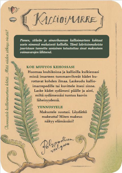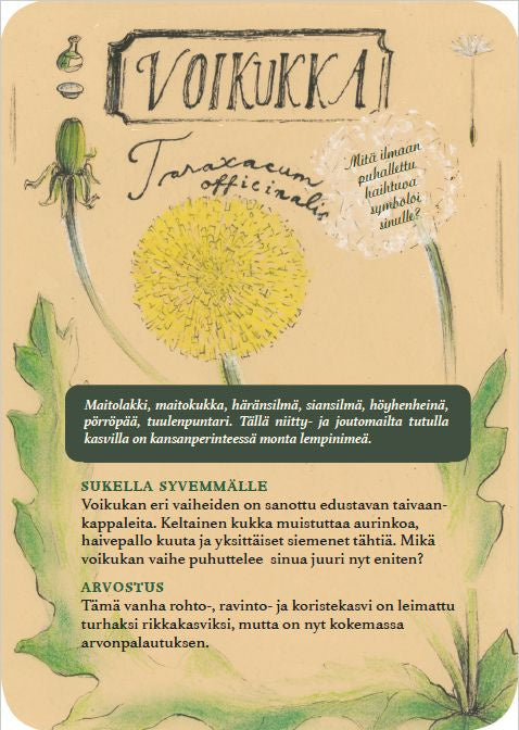 Kauniisti kuvitetut Kasvien kertomaa -kortit johdattelevat huomaamaan lähialueen luonnonkasvit ja pysähtymään niiden äärelle. Korttien avulla kasvit on helppo tunnistaa, ja niiden tarjoama perinnetieto inspiroi luomaan omakohtaisen suhteen kasveihin luovien, kehollisten harjoitteiden kautta. Kaun... Lue lisää