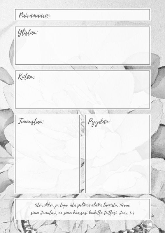 Tämä kaunis rukouspäiväkirja toimii apunasi rukouksessasi. Se innostaa ja vahvistaa rukouselämääsi. Voit kirjoittaa kirjaan rukous-, esirukous- ja kiitosaiheitasi. Kirjoita Jeesukselle myös toiveesi ja unelmasi. Kun kirjoitat rukoukset muistiin, niin huomaat myös paremmin rukousvastauksia ja voit... Lue lisää