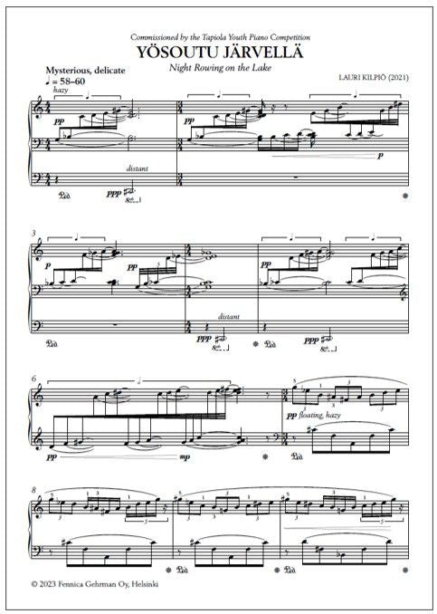 Lauri Kilpiö's (b. 1974) Night Rowing on the Lake (Yösoutu järvellä, 2021) for solo piano was commissioned by the Tapiola Youth Piano Competition and first peformed by its participants in November 2021. In about four minutes' duration the work travels from dreamlike floating visions to bright and... Lue lisää