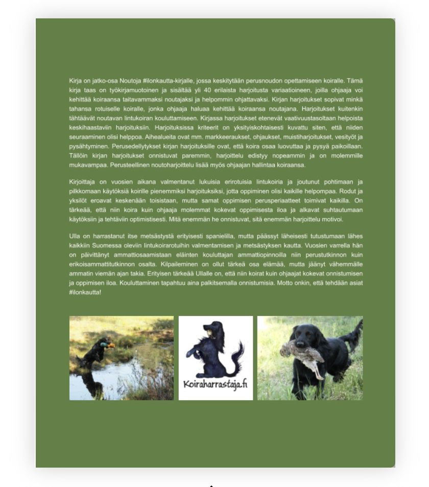 Kirja on jatko-osa Noutoja #ilonkautta-kirjalle, jossa keskitytään perusnoudon opettamiseen koiralle. Tämä kirja taas on työkirjamuotoinen ja sisältää yli 40 erilaista harjoitusta variaatioineen, joilla ohjaaja voi kehittää koiraansa taitavammaksi noutajaksi ja helpommin ohjattavaksi. Kirjan harj... Lue lisää