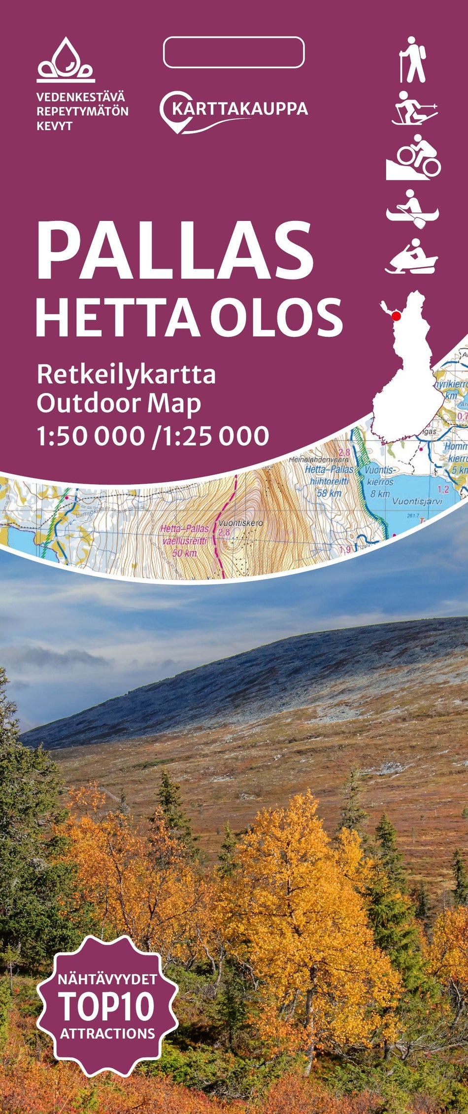 Pallas Hetta Oloksen retkeilykartta on aiemmin ilmestynyt Karttakeskuksen kustantamana. Kartan ulkoilutiedot on tarkistettu vuonna 2025.
