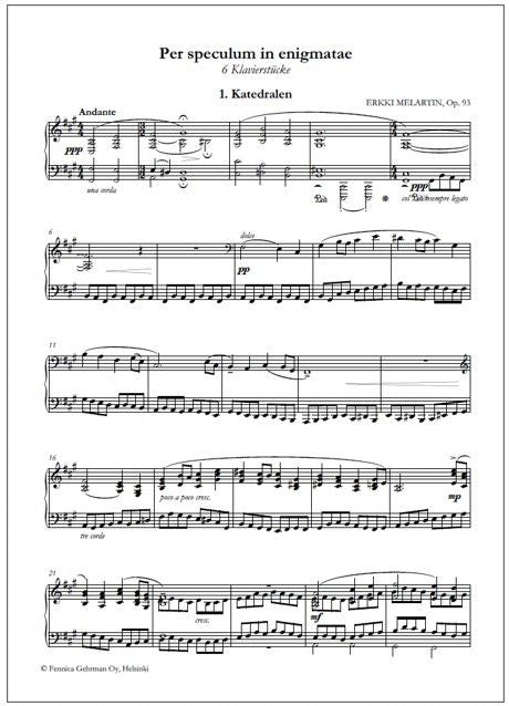 Erkki Melartinin kuusiosainen sarja pianolle, Per speculum in enigmatae op. 93 julkaistaan ensimmäistä kertaa yli sata vuotta syntymänsä jälkeen. Sarjan latinankielinen otsikko on suomeksi suunnilleen ”Peilin kautta näemme arvoituksen”. Todennäköisesti Melartin kokosi sen eri aikoina syntyneistä sävellyksistä, joilla ei ole alkujaan ollut välttämättä mitään yhteyttä toisiinsa. Raamatullinen otsikko viittaa enemmän henkistyneisyyden kuin uskonnollisuuden teemoihin, vaikka jotkin osat ovat nimeään myöten ohjelmallisia. Ensimmäinen osa Katedralen (Tuomiokirkko) on mahdollisesti Brüggen arkkitehtuurin innoittama. Toisessa osassa Die andere Seite (Toinen puoli) on ekspressionistisia piirteitä, ehkä myös Skrjabin-vaikutteita. Kolmannessa osassa Dunkle Träume (Synkät unet) koraalimaiset vasemman käden aiheet pyrkivät ylöspäin, mutta vaipuvat aina takaisin alas. Neljäs osa Schwester Namenlos (Sisar Nimetön) om 5/4-tahtilajiin sävelletty tuokiokuva. Osa Erinnerung (Muisto) on myöhäisromanttinen tunnelmakuva, jossa on epätavanomaisia fraasirakenteita. Vuoden 1913 lopulla valmistunutta varhaisversiota Melartin laajensi myöhemmin osalla Weihnachtsglocken (Joulun kellot).