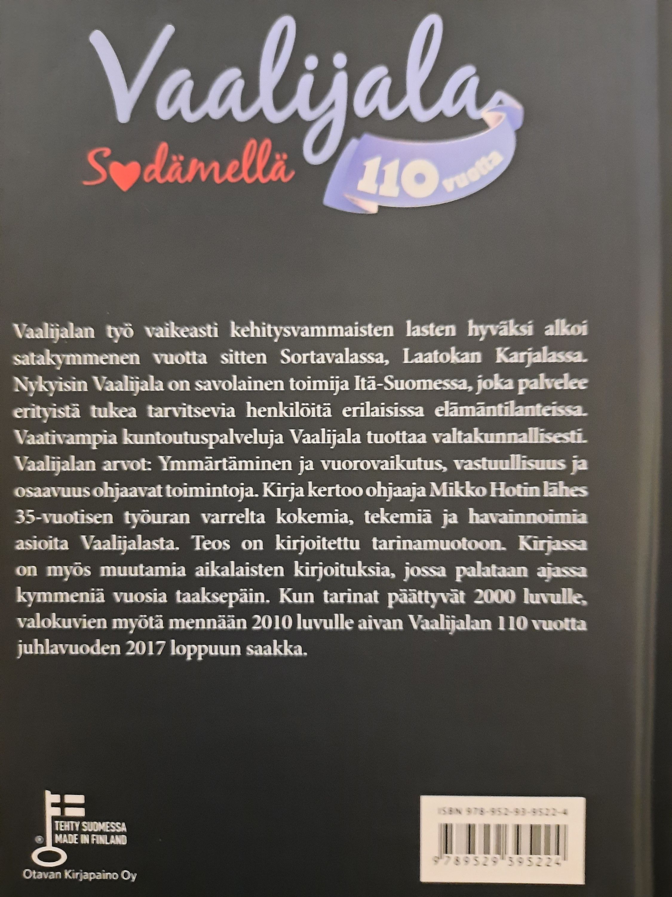 Vaalijalan työ vaikeasti kehitysvammaisten lasten hyväksi alkoi satakymmenen vuotta sitten Sortavalassa, Laatokan Karjalassa. Nykyisin Vaalijala on savolainen toimija Itä-Suomessa, joka palvelee erityistä tukea tarvitsevia henkilöitä erilaisissa elämäntilanteissa. Vaalijalan arvot: Ymmärtäminen j... Lue lisää