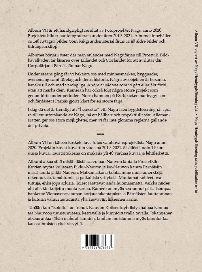 Album VII on täysin kaksikielinen ja kertoo Nauvosta ennen ja nyt pääosin kuvilla. Kirja on koossa B5 ja siinä on 120 sivua.