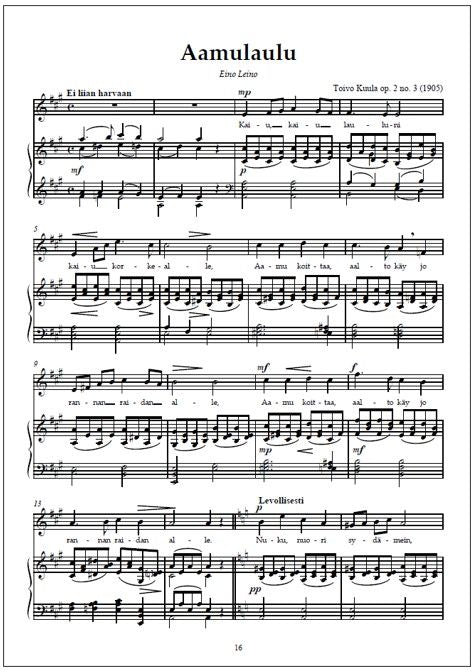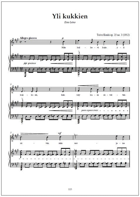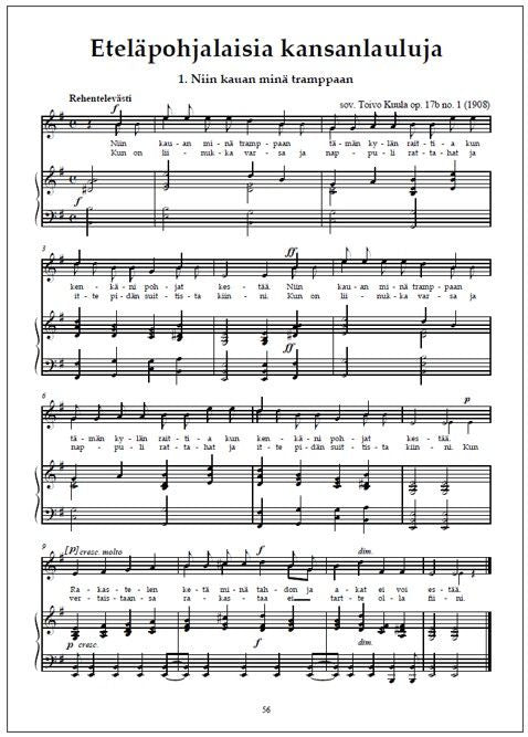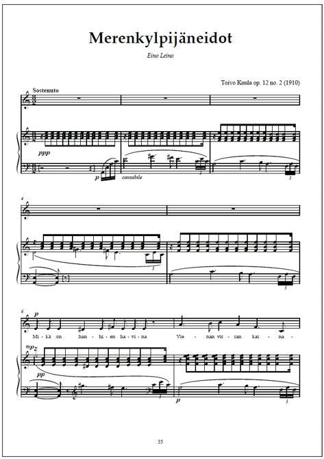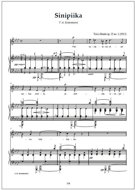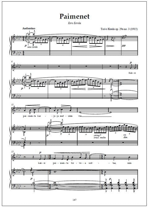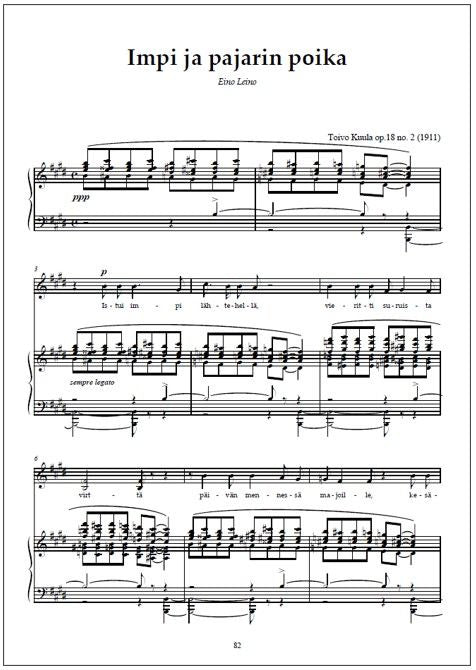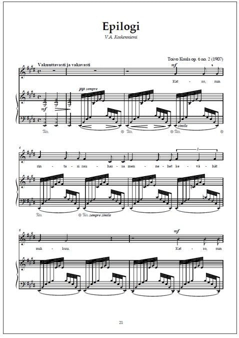 Toivo Kuula, who met an untimely death in 1918, composed songs which are among the finest of their kind ever composed in Finland. They perfectly reflect the serious mindscape, the richness of melody and underlying melancholy of the national soul. The broad, dynamic range of expression calls for a good vocal technique, a wide vocal span and considerable powers of interpretation.