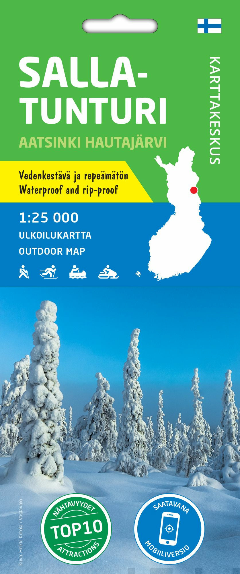 Ulkoilukartta Sallatunturi 1:25 000 on painettu vedenkestävälle synteettiselle materiaalille ja pakattu pahvikoteloon. Kestävät kotimaiset ulkoilukartat tunnistaa kannen keltaisesta merkinnästä.