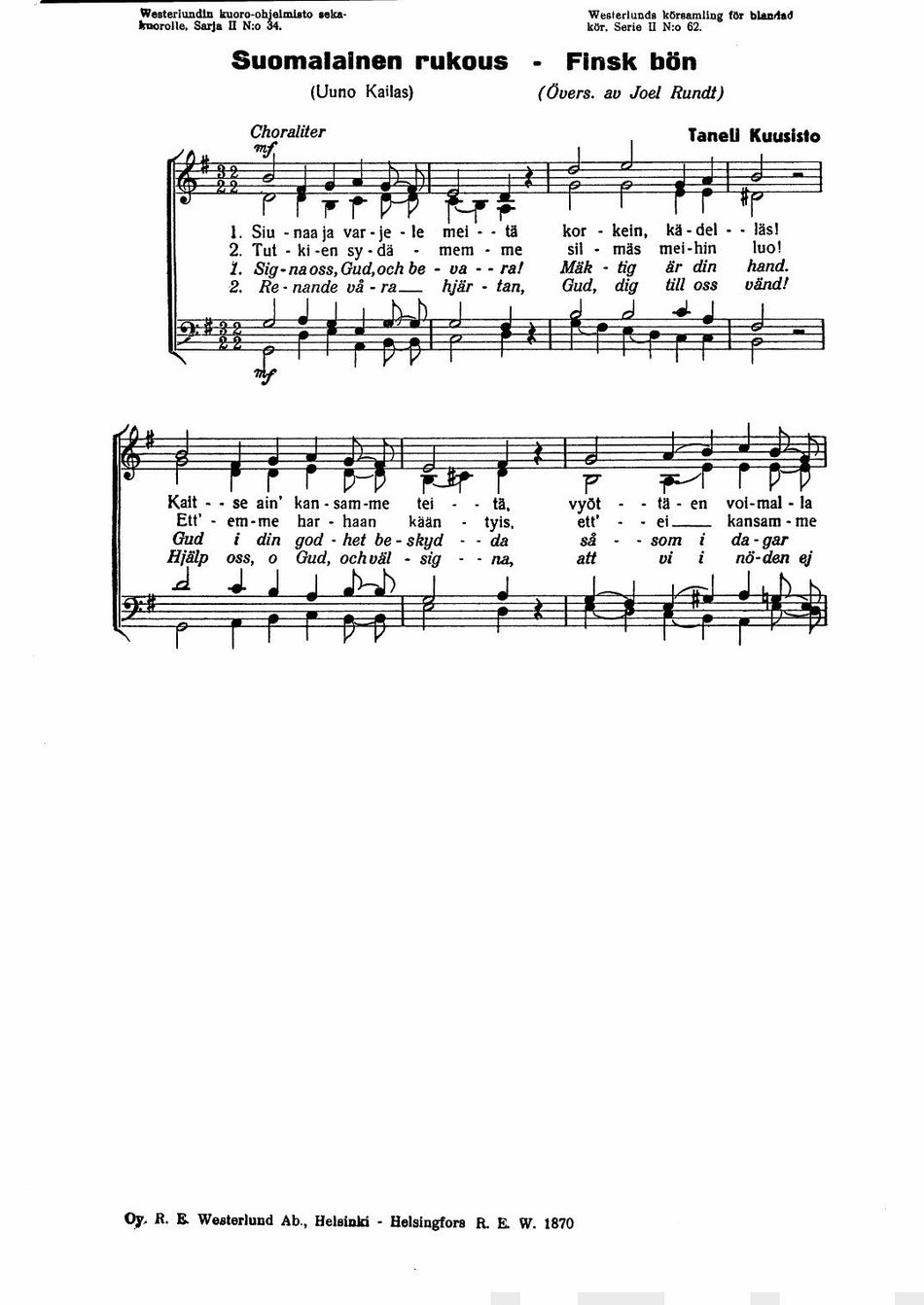 Taneli Kuusisto (1905-88) was a versatile influence in Finnish musical life: composer, pianist, organist, church musician, writer on music, and Rector of the Sibelius Academy. Of the more than 120 solo songs penned by him, Suomalainen rukous (A Finnish Prayer), a setting of a poem by Uuno Kailas ... Lue lisää