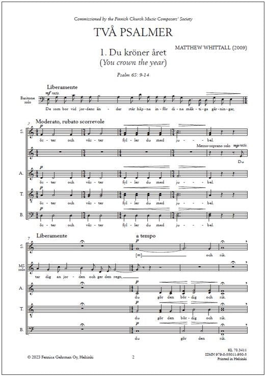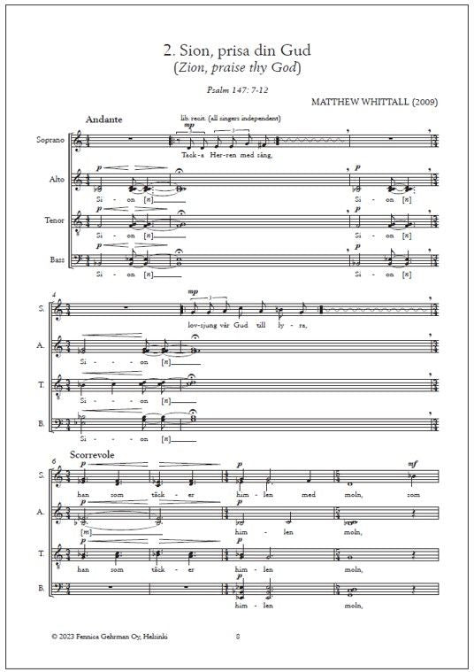 Matthew Whittall's pair of psalm-based settings was a commission from the Finnish union of church musicians, for Swedish-language pieces specifically intended for liturgical use. Du kröner året (You crown the year), to be sung on the feasts of Michaelmas and Thanksgiving. The composer tells: "Wanting to honor the spirit of the occasion without detracting from the prayer services themselves, I turned to the simple responsory style remembered from the Catholic services of my youth. Baritone and soprano soloists intone recitatives, which are answered by the main choir. The music is modal - completely diatonic, in fact - warm and restrained in expression, reflecting the psalm text's mood of fulfilled plenty. Sion, prisa din Gud (Zion, praise thy God) was written for the spring feast of Annunciation. The music is an attempt to reflect the psalm text's ambivalence, divided as it is between a call to give praise and thanks and a terse warning to remain humble and contrite. The piece thus moves from warm clouds of sound and gentle murmurings to a starker, chant-like texture, ending in a mood of unambiguous rejoicing as befit the occasion."